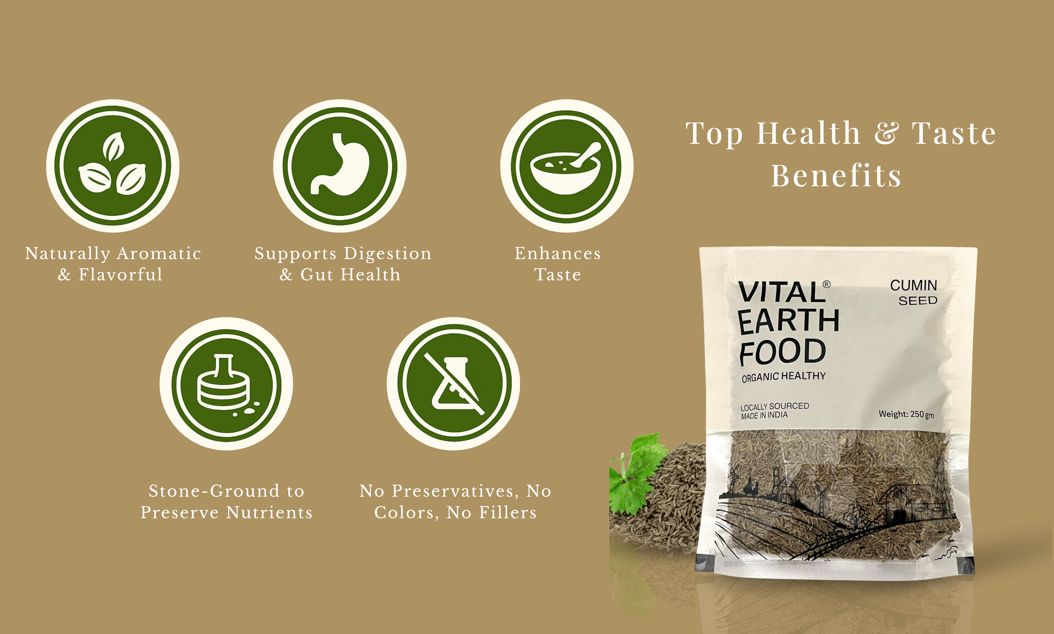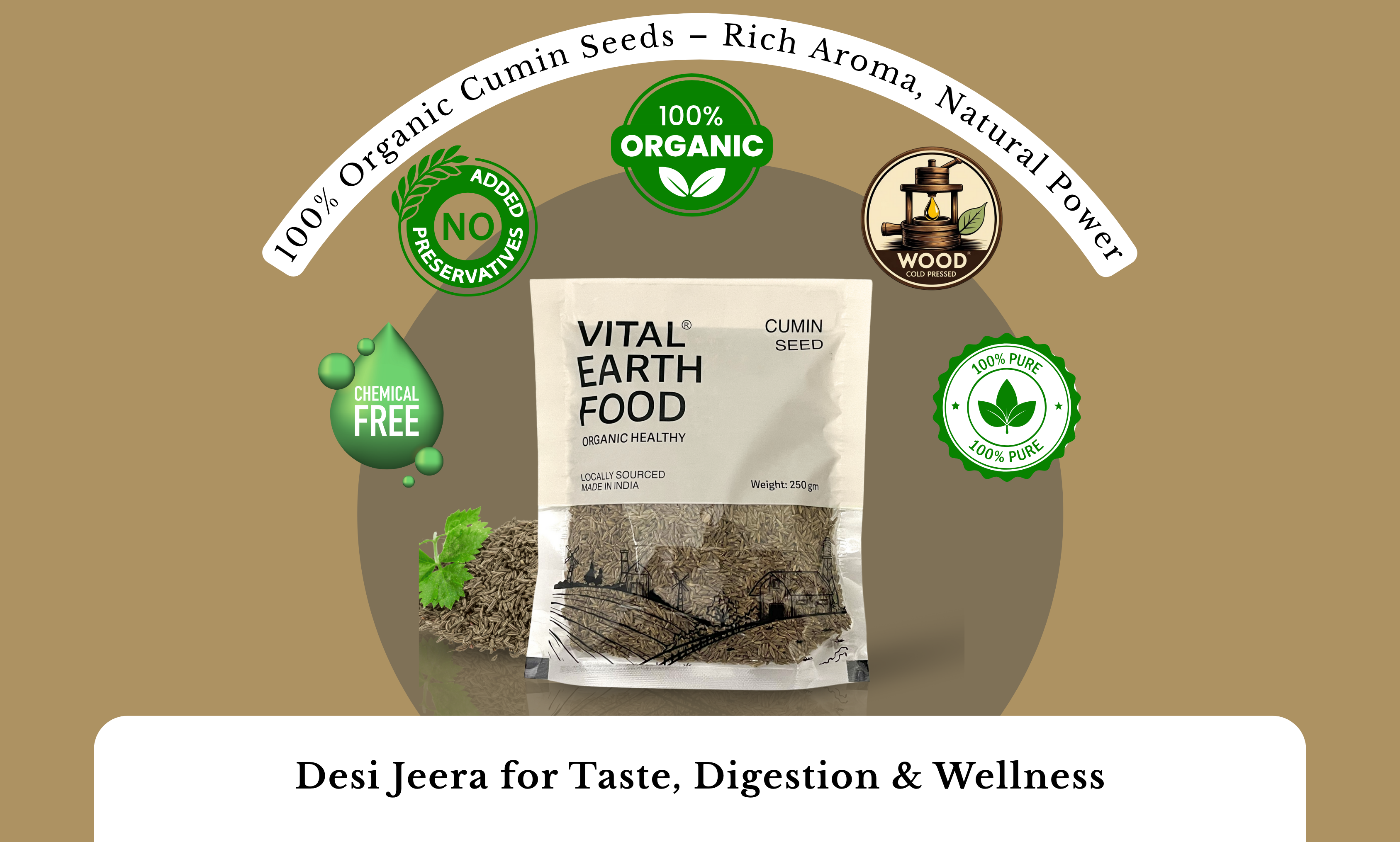 Cumin is one of the most essential Indian spices and a potent Ayurvedic ingredient known for aiding digestion, boosting immunity, and adding rich flavor to food. At Vital Earth, we bring you cumin in its purest, most natural form—straight from organic farms to your kitchen.