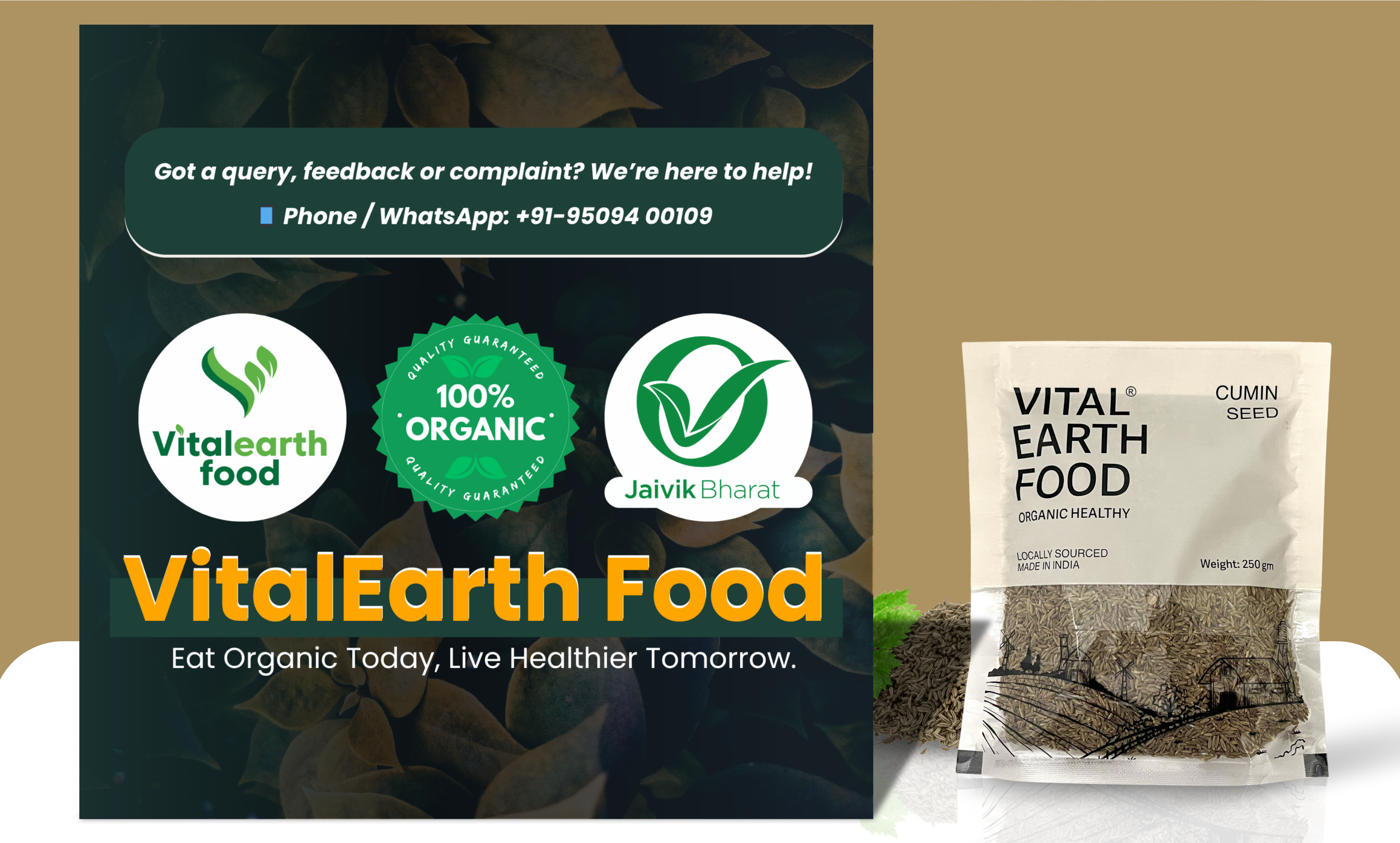 Vital Earth Organic Cumin Seeds (Jeera) are grown using 100% traditional and organic farming methods, without the use of any pesticides, synthetic fertilizers, or chemical enhancers. These small yet powerful seeds are carefully harvested, sun-dried, and stored in clean, airtight, and preservative-free packaging to maintain their natural aroma, flavor, and health-boosting properties.